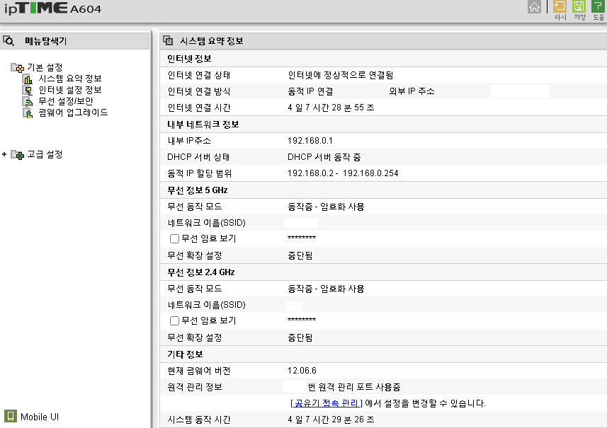 공유기 설정 메인페이지입니다.