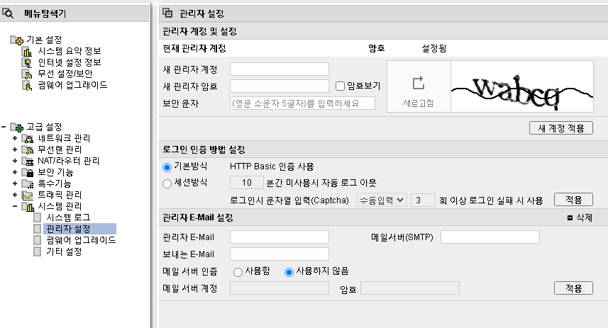 여기서 새관리자 계정과 암호를 입력하신후 보안문자까지 입력하고 '새 계정 적용' 버튼을 클릭합니다.